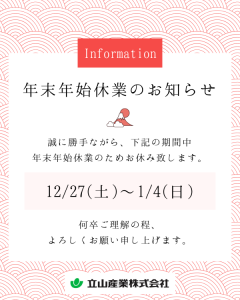 弊社では2025年12月27日(土)~2026年1月4日(日)までお休みとなります。